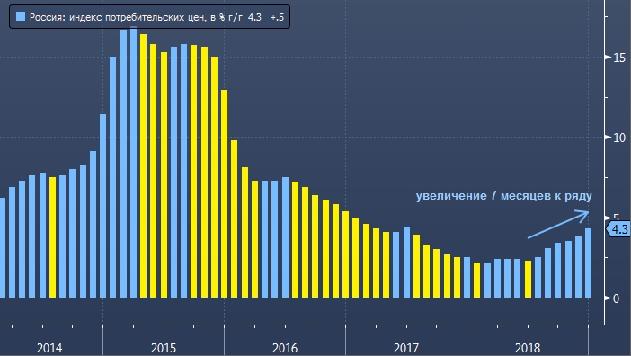 На прошлой неделе в четверг Росстат опубликовал в окончательном чтении данные по инфляции по итогам декабря 2018 года. По сравнению с предыдущим месяцем индекс потребительских цен резко вырос на 0.8%. Рост по сравнению с декабрем предшествующего года составил 4.3%. Экономисты Bloomberg прогнозируют инфляционный всплеск в январе до 5.5%, предупреждая, что к марту инфляция взлетит до 6.3%. При этом чрезмерный эффект от повышения налогов или ослабление курса рубля способны подтолкнуть инфляцию еще выше.