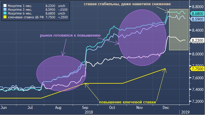 С тех пор как в середине декабря регулятор повысил ключевую ставку на 0.25% индексы Mosprime — независимые индикативные ставки предоставления рублевых кредитов на денежном рынке — остаются стабильны. Месячная ставка Mosprime заметно сократилась от максимума, в трех и шестимесячных ставках также наметилось снижение.