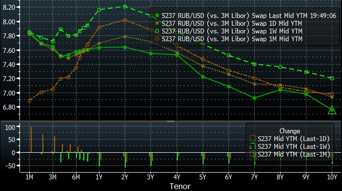 Нисходящая динамика на ближнем конце кривой доходности свопов также подтверждает, что рынок не закладывается на ближайшее повышение ключевой ставки.