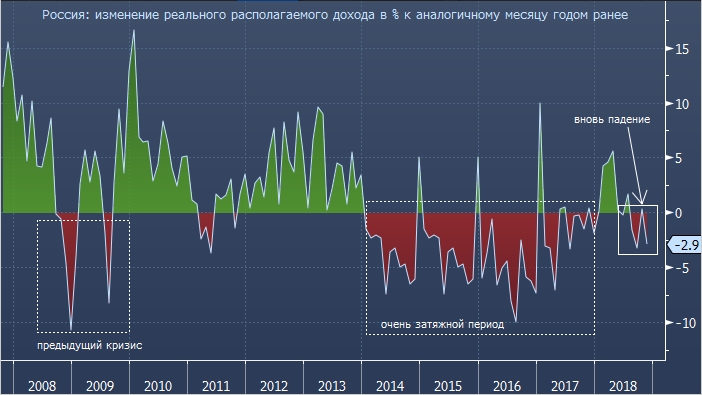 При этом показатель реального располагаемого дохода (то есть после уплаты налогов) в ноябре 2018 года сократился на 2.9% (прим. ProFinance.ru: данные за декабрь еще не опубликованы).
