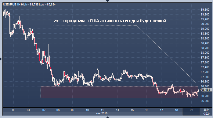 Налоговый период, выступающий поддержкой рублю, уравновешивается интервенции ЦБ, которые негативны для рубля. Рыночная активность сегодня будет невысокой из-за празднования в США Дня Мартина Лютера Кинга.