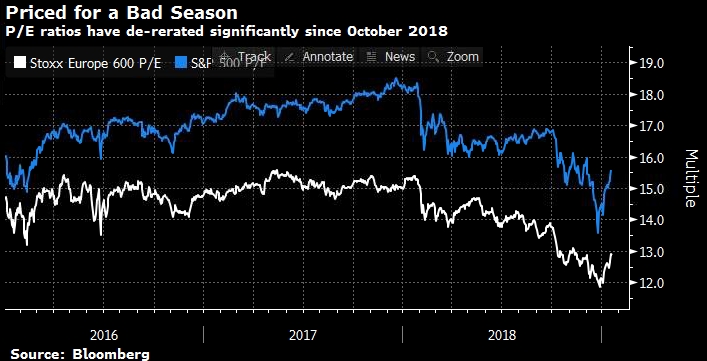 Об этом написал аналитик банка Мислав Матейка, который снизил свои ожидания роста прибыли на акцию в регионе на 3 процента за год. Тем не менее Матейка по-прежнему прогнозирует, что европейские акции вернутся к росту прибыли на 10 процентов к концу 2019 года, заявив при этом, что рынку необязательно видеть некоторый рост прибыли, чтобы найти силы для роста. Он проводит аналогию с 2016 годом, когда акции достигли дна в феврале, за 10 месяцев до того, как изменения EPS стали положительными.