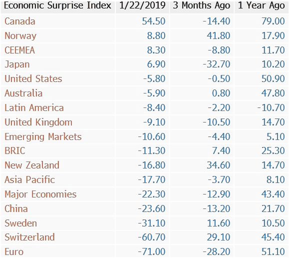 Citigroup опубликовал сравнительную таблицу индексов экономического сюрприза по различным странам и регионам. Положительное значение индекса означает, что фактические цифры экономической статистики были лучше прогнозов аналитиков. Отрицательное значение показателя свидетельствует об обратной ситуации. Показатель рассчитывается как взвешенное историческое стандартное отклонение фактических данных.