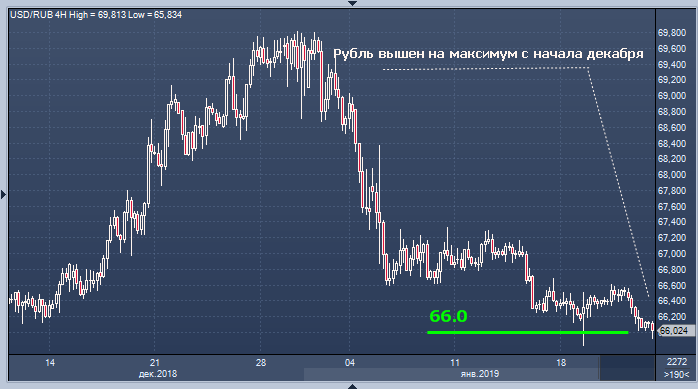 Пара доллар/рубль расчетами «завтра» опускалась чуть ниже отметки 66.00 и торгуется в 11:28 мск на уровне 65.99, максимуме для рубля с 7 декабря 2018 года. Пара евро/рубль расчетами «завтра» преодолела психологический рубеж 75.00, впервые с 14 декабря. Валюты emerging markets показывают смешанную динамику. Котировки нефти снижаются на фоне ухудшения перспектив мировой экономики и роста запасов в США. Мартовские фьючерсы на нефть Brent на лондонской бирже ICE Futures снизилась на 0.57% — до $60.79 за баррель. Фьючерс на нефть WTI на март на электронных торгах Нью-йоркской товарной биржи к этому времени подешевел также на 0.57% — до $52.32 за баррель.