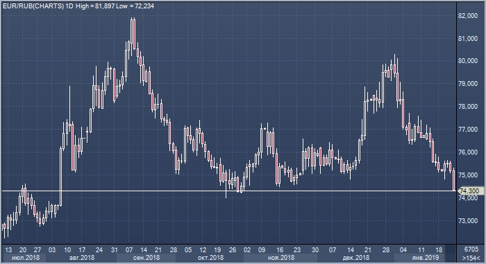 На торгах в четверг 24 января курс рубля по отношению к евро вырос на самого лучшего уровня с 31 октября и достиг 74.30 за единицу европейской валюты. На повестке дня тестирование значения 74 рубля за доллар. Последний раз этот психологический уровень курс тестировал 24 октября. Тогда цены не смогли закрепиться ниже круглой отметки и отскочили выше. Дешевле 74 рублей евро не стоил с 8 августа. В тот день рубль резко обесценился на новостях о санкциях.