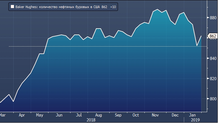 На предыдущей неделе (до 18 января) число нефтяных установок резко сократилось на 21 до 852 штук.