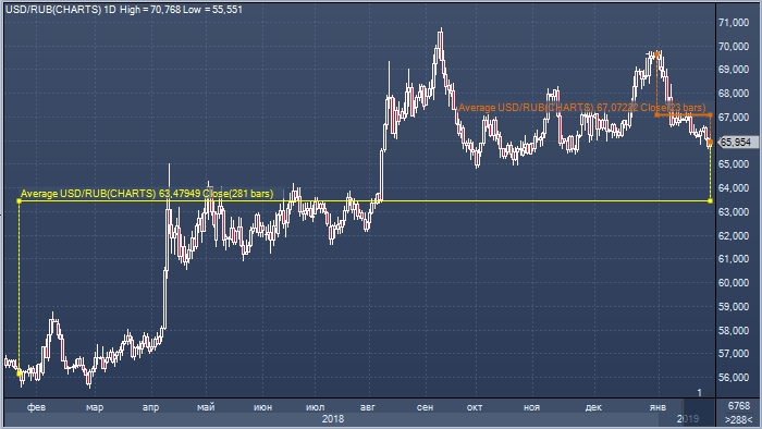 Стоит отметить, что сейчас средний курс с начала года составляет 67.07 рубля за доллар. Если посчитает скользящим темпом среднее годовое значение, то за период с 25 января 2018 года по 25 января 2019 года средний курс составляет 63.48 рубля за доллар.