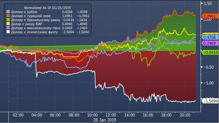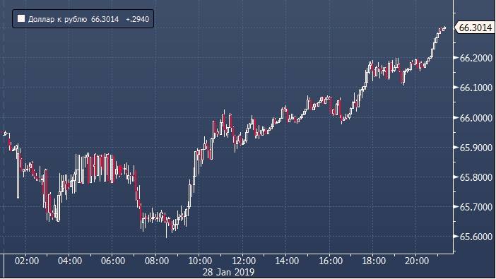Курс рубля подешевел в первый торговый день текущей недели. Помимо внешних факторов на российскую валюту оказало давление завершение январского налогового периода. Курс USDRUB вырос на 0.44% до 66.30 за единицу американской валюты. При этом рубль среди валют стран с развивающейся экономикой не выглядит аутсайдером. Этот статус закреплен за турецкой лирой, которая в понедельник подешевела к доллару более чем на 1%. Обесценивание южноафриканского ранда в процентах также превышает потери российской валюты, которая уступает мексиканскому песо. Лидером является бразильский реал — тот предпринимает попытки роста против валюты США.