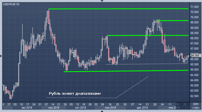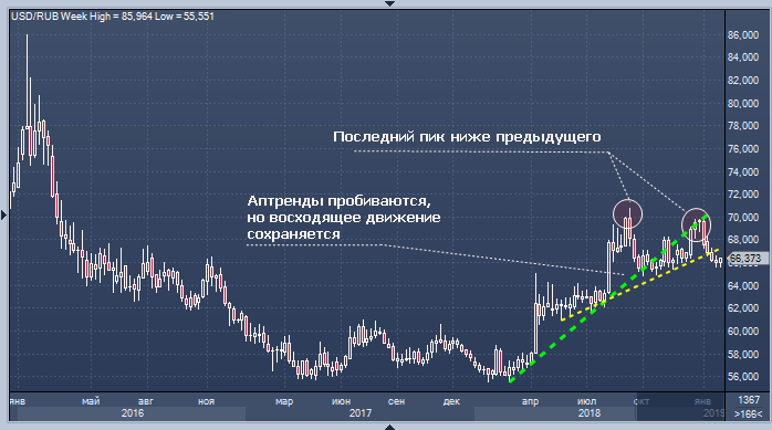 4. Теханализ. Недельный график: у нас аптренд, такими широкими затяжнымиступенями-диапазонами наверх. Если уж не вверх, то точно ровно вправо, а не вниз. Иными словами, рынок рубля снова стал диапазонным. Что об этом говорит? Последняя вершина была ниже предыдущей, а значит аптренд дал трещину. Чтобы подтверждать аптренд, быкам нудно прорываться наверх, выше 70. Днвной график: одни диапазоны и никакого просвета. Мы протестировли нижнюю границу рейнджа на 65–66 и вроде бы должны отправится наверх по законам рыночного броуновского движения или постулата о том, что без падения не может быть роста, а без роста падения.