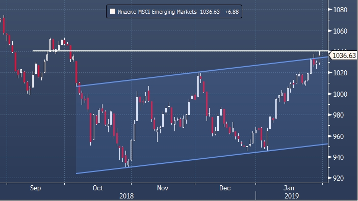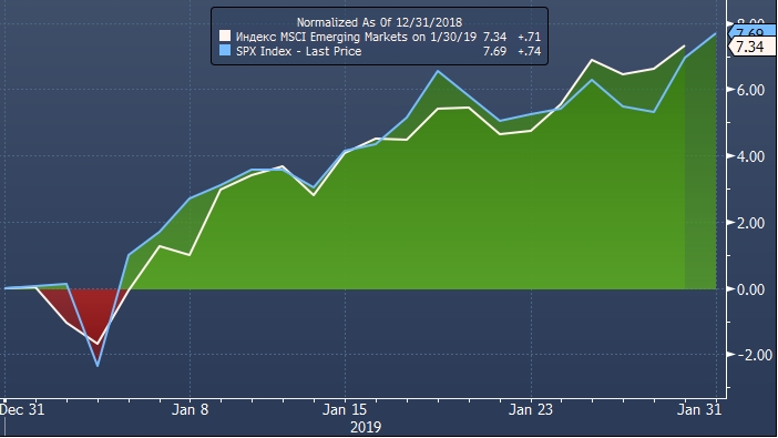Акции развивающихся рынков устроили в январе полноценное ралли и завершают месяц на позитивной ноте. Индекс MSCI Emerging Markets достиг в четверг 4-месячного максимума, перекрыв падение в декабре. Столь радужное завершение первого месяца 2019 года обеспечили голубиные комментарии главы ФРС Джерома Пауэлла и возвращение к работе Федерального правительства.