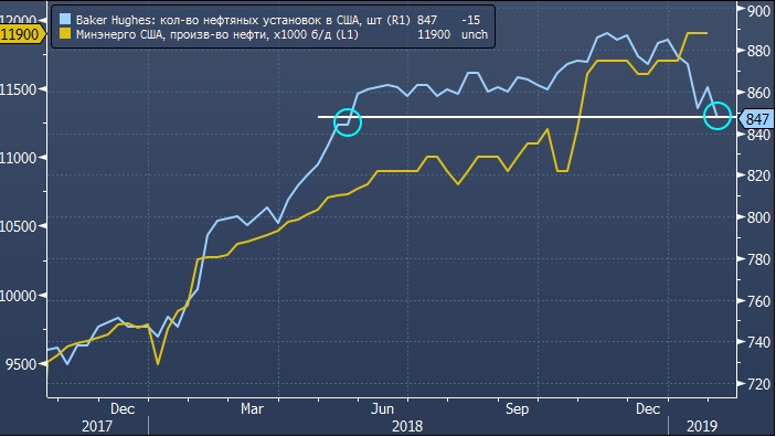 Максимум 2018 года — 888 действующих нефтяных буровых. Это пик был сформирован на неделе до 16 ноября. Абсолютный максимум количества нефтяных буровых в США был достигнут в октябре 2014 года. Тогда было зарегистрировано 1609 штук. Сейчас на 66% меньше.