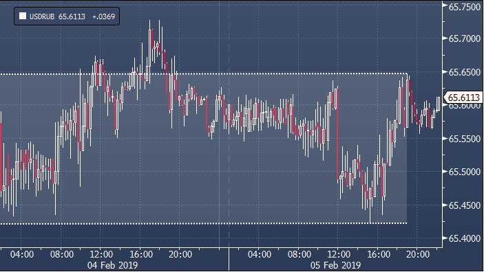 Курс рубля по отношению к доллару на торгах во вторник 5 февраля колебался в очень узком торговом диапазоне между 65.65 и 65.42. В первой половине торговой сессии валютной секции Мосбиржи рубль пытался укреплятся, выбрав в качестве драйвера новость от Минфина о том, что в феврале ежедневные объемы покупок иностранной валюты в рамках бюджетного правила снизятся до 9.7 млрд рублей по сравнению с 15.6 млрд рублей в январе. Затем рубль вернул американскому конкуренту достижения на фоне снижения цен на нефть: котировки Brent упали во вторник на 0.55% до $62.16 за баррель, WTI подешевела на 1.35% до $53.82 за баррель.