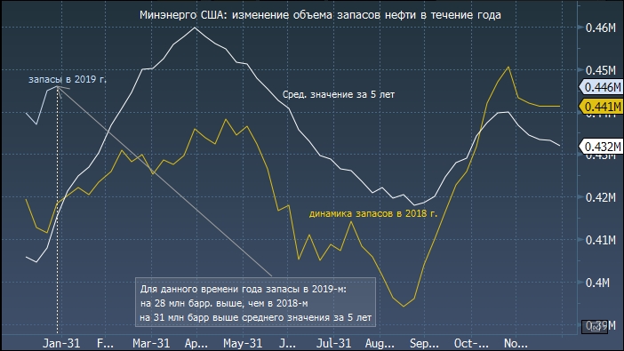 Согласно прогнозу экспертов, опрошенных агентством Bloomberg, цифры этого ведомства покажут, что в США за отчетный период (в баррелях):