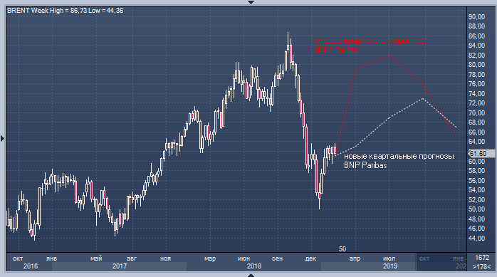 BNP Paribas сообщает о снижении прогноза по средней цене нефти марки брент на 2019 год с $76 до $68, по WTI — с $69 до $61.