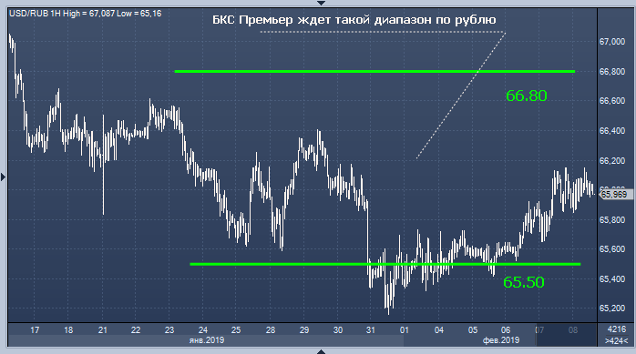«Так как основные риски, в том числе геополитические, в начале 2019 года остаются для РФ полностью актуальными, мы не исключаем возможностей реализации дальнейших шагов по повышению ставки. В результате ожидаем, что в перспективе следующей недели курс рубля будет двигаться в общем тренде с валютами сектора ЕМ в диапазоне 65.5–66.8», — комментирует ситуацию главный аналитик «БКС Премьер» Антон Покатович.