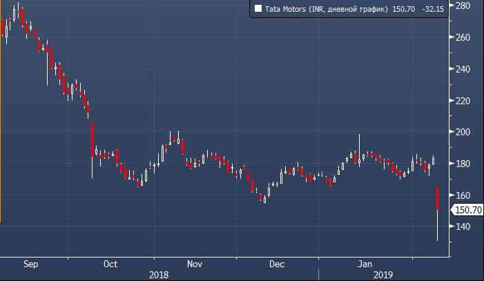 Акции Tata Motors начали торги 8 февраля с впечатляющего обвала, и, хотя первоначальные потери почти в 28.6% удалось сократить, котировки теперь более чем на 17% ниже уровней закрытия торгов в четверг. Причиной такой печальной для инвесторов динамики стала вчерашняя публикация финансовых результатов Jaguar Land Rover. Британский производитель, которого Tata Motors купила у Ford в 2008 за $2.3 млрд, в четвертом квартале 2018 получил убыток в размере $3.8 млрд.