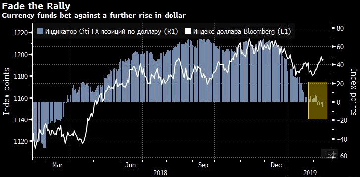 «Голубиный» сдвиг Федеральной резервной системы начинает снижать привлекательность доллара для валютных спекулянтов. Индекс Citigroup Inc. опустился ниже нуля впервые с марта 2018 года, указывая на то, что валютные фонды удерживают чистые короткие позиции по американской валюте. Это сигнализирует о том, что дальнейший рост доллара может быть трудным после его самой длинной победной серии за последние три года.