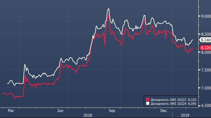 - ОФЗ-ПД 26224 с погашением 23/05/2029 на сумму в 3.89 млрд рублей при спросе в 30.5 млрд рублей и средневзвешенной доходности в 8.37%