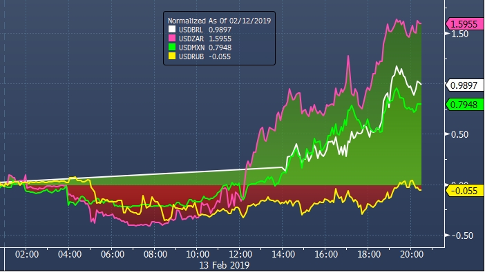 Рубль на торгах в среду 13 февраля выглядел обособленно относительно основных конкурентов в сегменте развивающихся валют (Emerging currencies). Так, южноафриканский рэнд, бразильский реал и мексиканский песо упали против доллара на 1.6%, 0.99% и 0.79% соответственно. Однако рубль в течение всего дня предпринимал попытки роста к американской валюте и на момент написания статьи прибавляет в цене символические 0.05%.