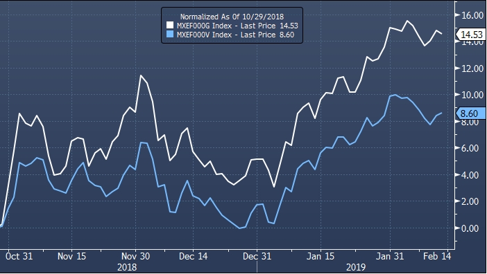 Распродажа прошлого года, продолжавшаяся с января по октябрь, способствовала снижению сравнительной стоимости акций EM до минимального уровня с марта 2014 года, и управляющие компании начали говорить, что бумаги слишком дешевые, чтобы их игнорировать. С тех пор индекс MSCI Emerging Markets вырос на 12 процентов, чему способствовали надежды на завершение торгового противостояния США и Китая и приостановка ралли доллара.