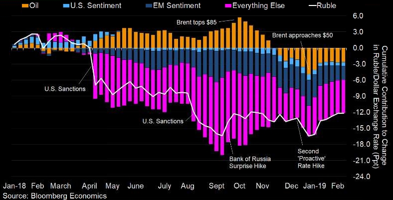 Настроения, которые чувствительны к перспективам ужесточения санкций, стали доминирующим фактором для валюты. Цены на сырую нефтьпо-прежнему имеют значение: в прошлом году на нефть и газ приходилось почти 60% экспорта и чуть меньше половины федерального дохода. Но правительство помогло изолировать экономику и рубль от колебаний цен с помощью бюджетного правила, которое направляет избыточные доходы от нефти и газа в валютные резервы.