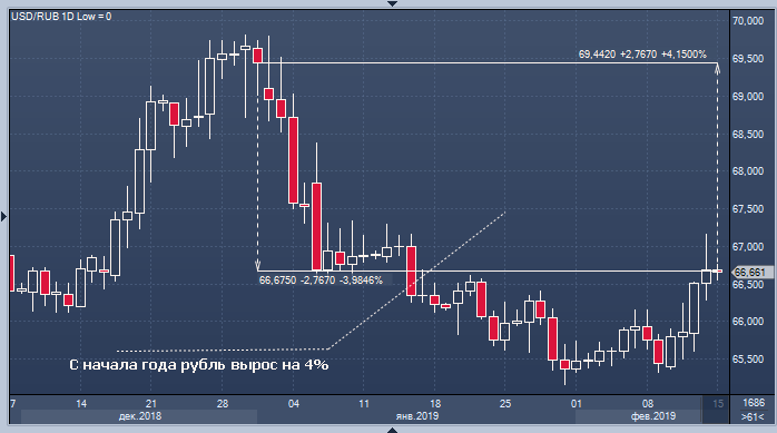 Рубль подскочил на 6% по отношению к доллару в январе, но в основном это нивелировало снижение, которое произошло в конце 2018 года. Без учета этой волатильности обменный курс колебался в районе 66–67 рублей за доллар с сентября, когда Банк России успокоил финансовые рынки упреждающим ужесточением монетарной политики. Примечательно, что цены на нефть упали за тот же период.