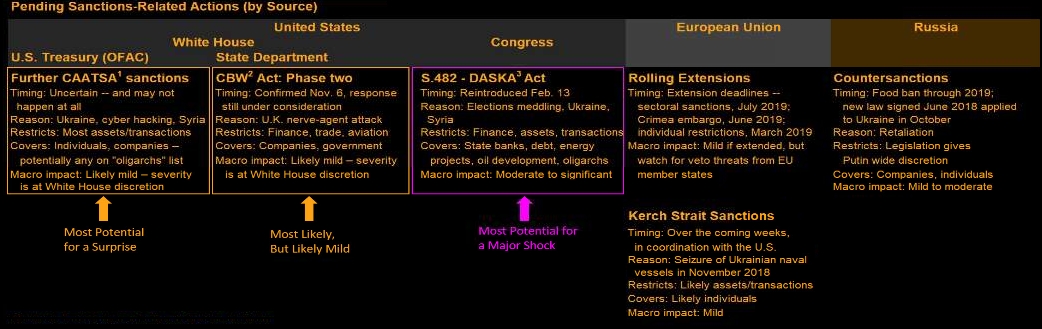 Как видно из приведенной ниже таблицы, сохраняется угрозы санкций и по другим направлениям. Администрация Трампа, вероятно, продвинется вперед со вторым раундом ограничений, направленных на наказание России за предполагаемое использование химического оружия в прошлом году в Солсбери, Великобритания.