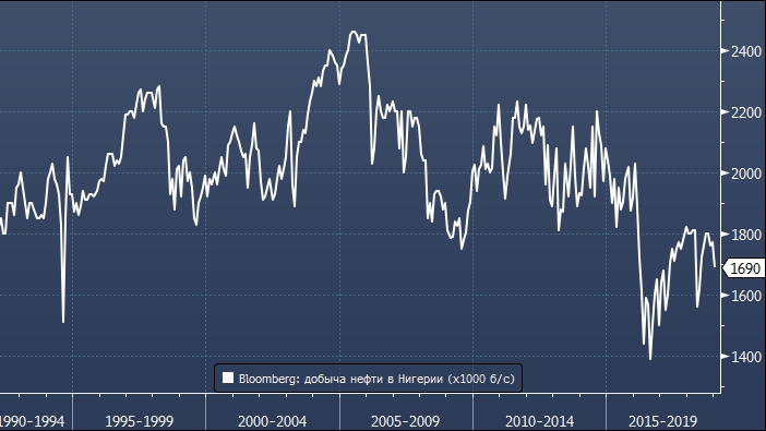 JODI ранее сообщало, что добыча в Нигерии в декабре 2018 выросла на 3.9% м/м до 1.873 млн баррелей в сутки, а экспорт вырос на 7.6% до 1.867 млн б/с. По данным Bloomberg, добыча в стране в декабре подросла лишь на 0.5% до 1.770 млн б/с, а в январе сократилась до 1.690 млн б/с — в рамках ОПЕК+ для страны была установлена квота добычи в размере 1.685 млн б/с.