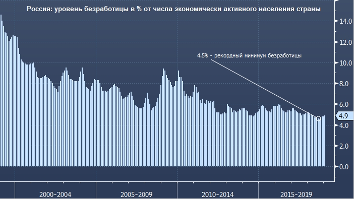 Уровень безработицы в январе составил 4.9%. Это на 0.1% выше, чем в предыдущем месяце, но соответствует прогнозным оценкам. Численность рабочей силы составила 74.9 млн человек, или 51% от общей численности населения страны. При этом зарегистрированы в качестве безработных в органах службы занятости населения, по данным Роструда, 0.7 млн человек, в том числе 0.6 млн человек получали пособие по безработице.