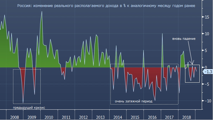 Реальные располагаемые денежные доходы (доходы за вычетом обязательных платежей, скорректированные на индекс потребительских цен), по предварительным данным, в январе 2019 г. по сравнению с январем 2018 г. снизились на 1.3%. В декабре показатель символически вырос на 0.1%. Январские цифры оказались хуже прогнозов, поскольку эксперты ожидали снижение реального располагаемого дохода российских граждан на 0.9%.