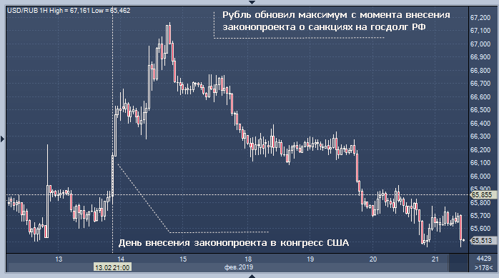 На графике отчетливо видно, что рубль обновил максимальные уровни с момента внесения законопроекта о новых санкциях против России в американский конгресс. Рубль торгуется в четверг утром 21 февраля на максимальных отметках с 11 февраля: 65.50 рубля за доллар.
