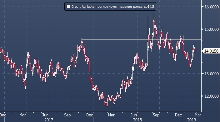 Клиентам стоит открывать длинные позиции по доллар/рэнду (USD/ZAR) в расчете на ослабление рэнда до 14.5 за $1, написал в обзоре аналитик Credit Agricole Гийом Треска. Стоп-лосс должен быть установлен на 13.64. Бюджет на 2019-20гг министра финансов ЮАР Тито Мбовени, который "в целом не разочаровал", "может в ближайшие дни спровоцировать Moody’s на ряд негативных" комментариев. "Мы ожидаем, что волатильность останется высокой".