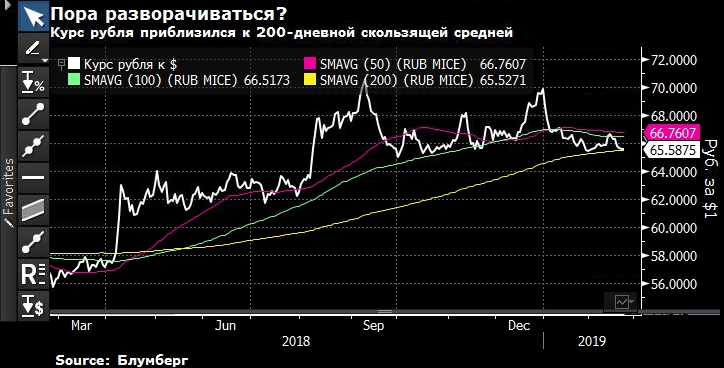 Рубль является лучшей валютой в 2019 году. Он уже третий день безуспешно заигрывает с 200-дневной скользящей средней, что говорит о росте шансов на разворот восходящего тренда. Этот ключевой уровень сопротивления вряд ли может быть пробит, в том числе с учетом скорого исчезновения поддержки со стороны налоговых выплат, в то время как краткосрочные геополитические риски обостряются.