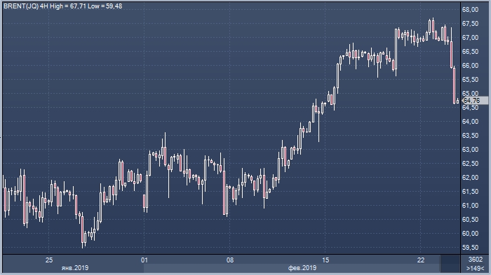 Апрельские фьючерсы на WTI упали на 3.4% до $55.30 за баррель. Апрельский контракт на Brent, экспирация которого состоится в четверг 28 февраля, потерял в цене 3.30%, снизившись до $64.91 за баррель. Североморский сорт упал ниже $65 за баррель впервые с 15 февраля потеряв из-за одной фразы Трампа достижения 6 торговых дней.