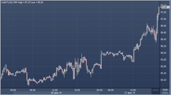 Цены на нефть выросли в качестве реакции на опубликованные данные. Котировки WTI прибавляют 3.28% до $57.35 за баррель, Brent растет на 2.02% до $66.53 за баррель (прим. ProFinance.ru: это котировка апрельского фьючерса, который экспирируется в четверг 28 февраля.)