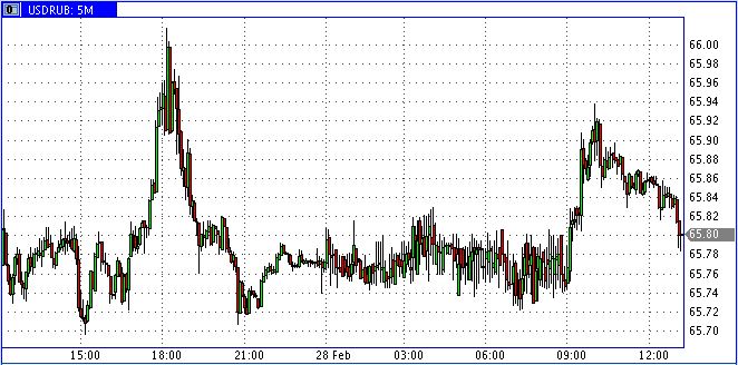 Перед началом торгов в валютной секции Московской биржи курс USDRUB поднялся до 65.95, однако затем довольно уверенно отскочил вниз. Вблизи 66.00 находятся предложения на продажу валюту от экспортеров, которые поддерживают рубль, сообщает Reuters, ссылаясь на информацию от дилера крупного банка.