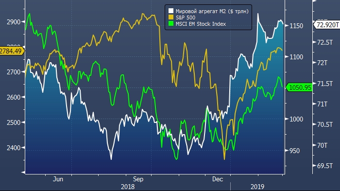 Интересно, что мировой рынок акций растет на фоне заметного ухудшения макроэкономической статистики, которое компенсируется возобновившимся в ноябре ростом мировой денежной массы* (см. график выше). Отметим, что рынок акций EM в значительно большей степени коррелирует с динамикой мирового агрегатора M2, нежели S&P 500.