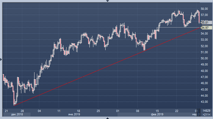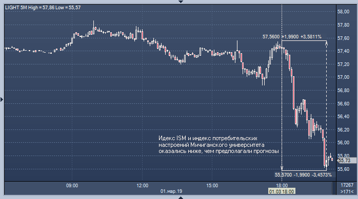 Новости о падении индекса деловой активности ISM в обрабатывающей промышленности США до минимального уровня за последние два года лишили быков по нефти желания оставаться в лонгах. Нефть и до публикации ощущала усиление интереса к фиксации прибыли, учитывая неудачу при попытке преодолеть сопротивление у максимумов прошлой недели и близость выходных. Публикация же статистики из США стала катализатором для активной ликвидации длинных позиций, в результате чего американская WTI подешевела на два доллара — до $55.57 за баррель. В центре внимания теперь находится поддержка в районе $55 за баррель, прорыв ниже которой будет означать ухудшение технической картины и потенциал для более глубокой коррекции.