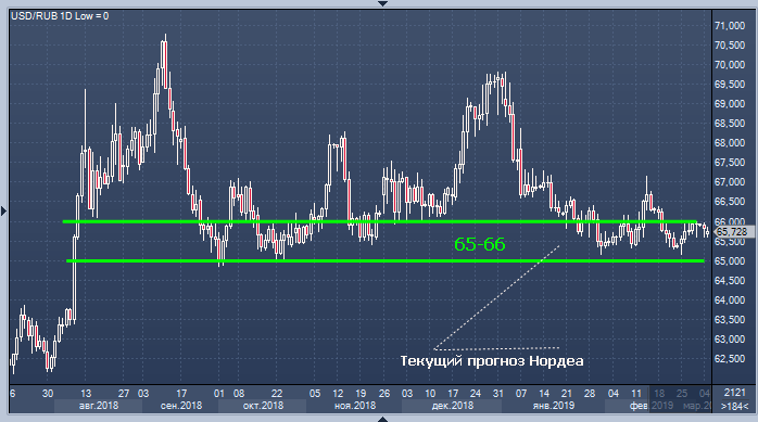 Пока же актуальными для рубля остаются диапазоны 65–66 и 74–75 в паре с долларом и евро, считают в Нордеа.