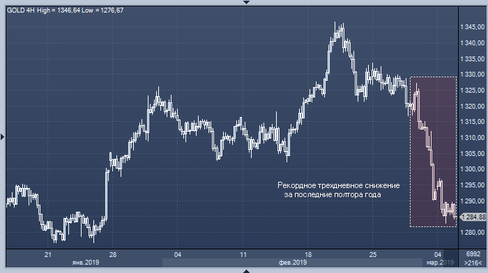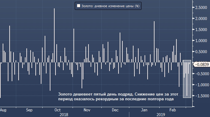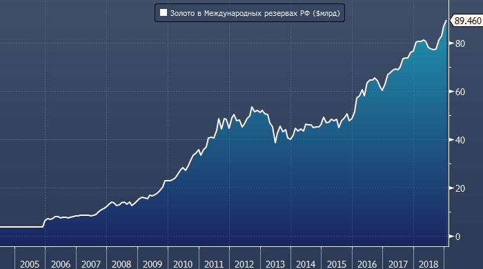 По состоянию на 31 января 2019 года, объем золотого запаса РФ достиг нового рекордного значения (свыше 2 100 тонн), а его стоимость взлетела до $89.5 млрд. Однако за последние три торговых сессии котировки драгметалла снизились почти на 3.5%, в результате чего соответствующая позиция Банка России подешевела как минимум на 3% (ProFinance.ru: если регулятор не продолжил покупать в феврале).