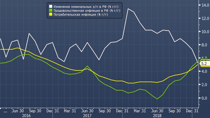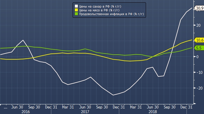 В январе цены на продовольствие выросли в среднем на 5.5% г/г, но некоторые ключевые продукты питания подорожали гораздо сильнее. Из-за засухи и плохого урожая в Краснодарском крае, на который приходится 25% всего производства в стране, цены на сахар выросли на 30.9% г/г. Кроме того, пошлины на сахар, введенные в рамках ЕАЭС, привели к снижению его импорта в Россию. Другой важнейший продовольственный товар, мясо, подорожал на 10.6% г/г.