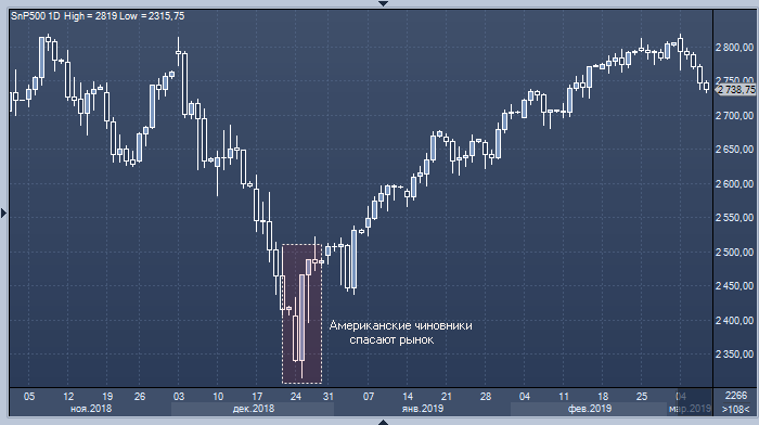 23 декабря, в самый разгар обвала S&P 500, глава Минфина Стивен Мнучин собрал рабочую группу по финансовым рынкам, дав инвесторам понять, что государство намерено вмешаться в происходящее. Через два дня уже сам Дональд Трамп посоветовал американцам покупать акции.