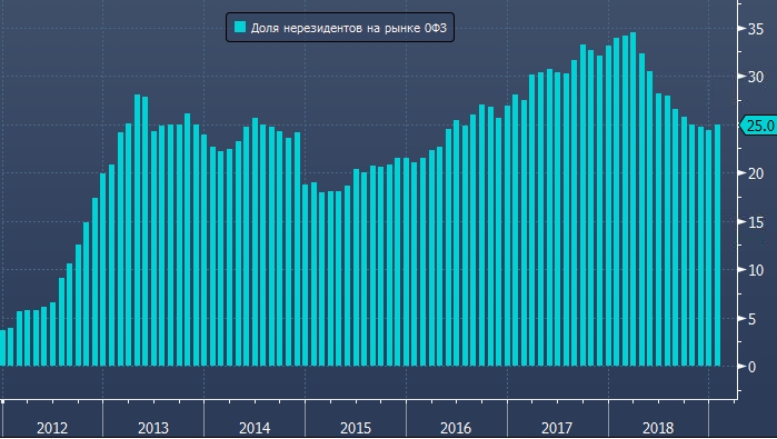 «Доля вложений в ОФЗ нерезидентов на счетах иностранных депозитариев в Национальном расчетном депозитарии (НРД) в общем объеме рынка ОФЗ за февраль выросла с 24.4% до 25.5%, что в объемах вложений по номиналу соответствует росту с 1.796 триллиона рублей до 1.884 триллиона рублей», — говорится в обзоре рисков финансовых рынков, опубликованном на сайте Банка России.