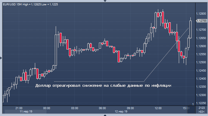 Курс доллара довольно живо отреагировал на мягкие инфляционные данные в США, позволяющие ФРС продлить паузу в ужесточение монетарной политики. Индекс потребительских цен (CPI) вырос в феврале в Штатах на 0.2% относительно января 2019 года и на 1.5% относительно февраля 2018 года. Аналитики ждали рост на 0.2% и 1.6% соответственно. В январе рост инфляции составлял 0% и 1.6% соответственно. Базовый CPI, исключающие волатильные цены продуктов питания и энергоносителей, вырос в феврале на 0.1% м/м и 2.1% г/г при прогнозе роста на 0.2% м/м + 2.2% г/г. В январь рост составлял +0.2% м/м + 2.2% г/г.