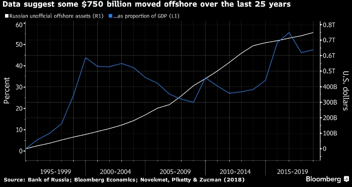 За последние 25 лет из России за границу ушло активов, стоимость которых эквивалентна $750 млрд, подсчитали эксперты Bloomberg Economics. И это произошло при условии, что страна испытывает дефицит инвестиционного капитала, а такое количество денег очень могло бы пригодиться российской экономике, подчеркивают исследователи.