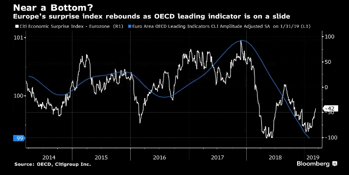 Перспективы евро могут стать более радужными, так как импульс европейских данных начинает показывать некоторые признаки оживления. ЕЦБ ухудшил свои прогнозы экономического роста на 2019 год для Европы и отодвинул планы повышения процентных ставок, оставив евро в депрессии. В то время как последние данные подтверждают, что экономика остается в плохом состоянии, происходит уменьшение дисконта между прогнозами экономистов и фактическими цифрами экономических отчетов. Восстановление индекса сюрпризов Citigroup для еврозоны сигнализирует о том, что опережающий индикатор ОЭСР для региона также, возможно, миновал дно. Евро может укрепиться, если Европа, одно из наиболее самых слабых звеньев в мировой экономике, сможет развернуться.