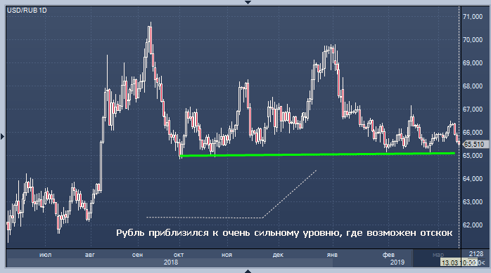 А вот аналитики все больше приходят к выводу, что рубль достиг своего потолка, и поддержка сезонно высокого профицита текущего счета РФ вскоре иссякнет. Во 2 квартале курс составит 66.42 рубля за $1, а к концу года валюта РФ ослабеет до 67, показал средний прогноз аналитиков, опрошенных агентством Bloomberg. Минэкономразвития РФ на минувшей неделе понизило прогноз среднего курса рубля в 2019 году до 66.4 за $1 с 63.9.