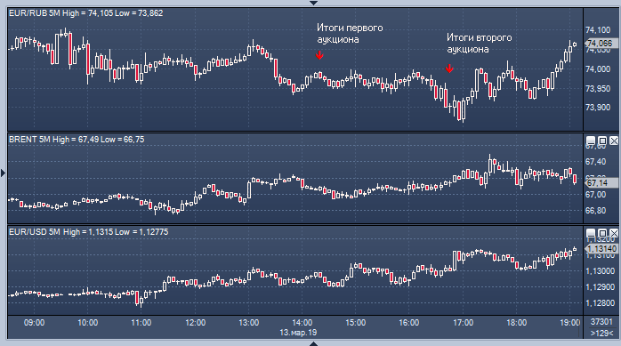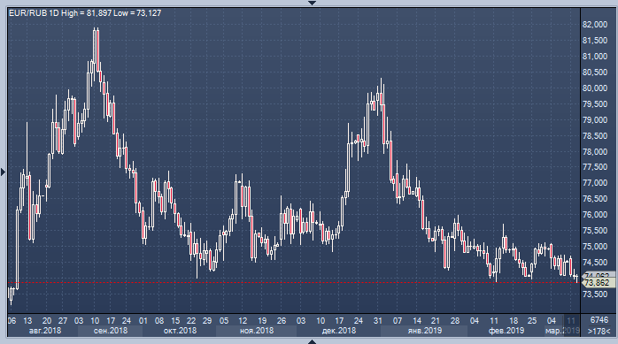Несмотря на развитие восстановления EURUSD, курс евро к рублю сохраняет устойчивую тягу к развитию нисходящего движения, и в ходе торгов в среду 13 марта быкам удалось продавить пару к минимальным уровням с августа 2018 года в районе 73.86. В условиях благоприятной динамики цен на нефть настрой в отношении российской валюты остается позитивным, и быки по рублю с радостью воспользовались новостями о том, что Минфин разместил облигации федерального займа (ОФЗ) на рекордные 91.4 млрд рублей. Итоги аукционов были восприняты участниками рынка как свидетельство того, что доходность российских активов, несмотря на санкционные риски, остается привлекательной для инвесторов.