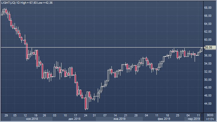 Цены на нефть марки WTI на торгах в среду 13 марта достигли $58.06 за баррель. Это самое высокое значение в 2019 году и является максимумом с 13 ноября 2018 года (4-месячный пик). С начала года цены выросли на 27.5%.