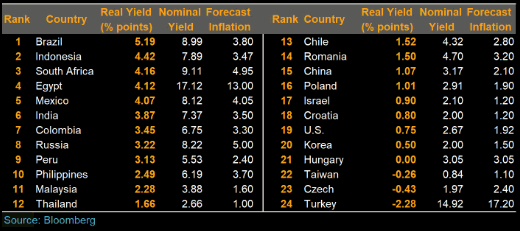 Агентство Bloomberg составило рейтинг развивающихся стран, облигации которых выглядят наиболее привлекательно с точки зрения реальной доходности. В тройку лидеров вошли Бразилия, Индонезия и ЮАР, а замыкают список из 24 стран Тайвань, Чехия и Турция. Россия расположилась на восьмом месте.